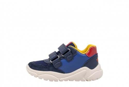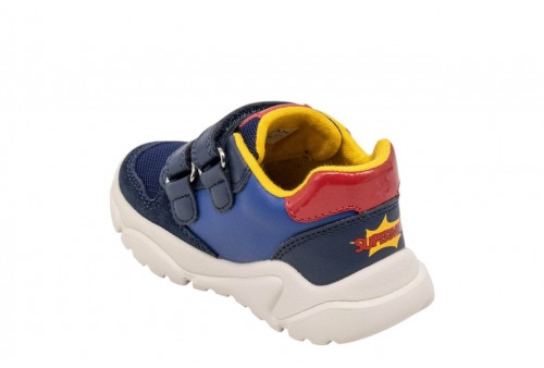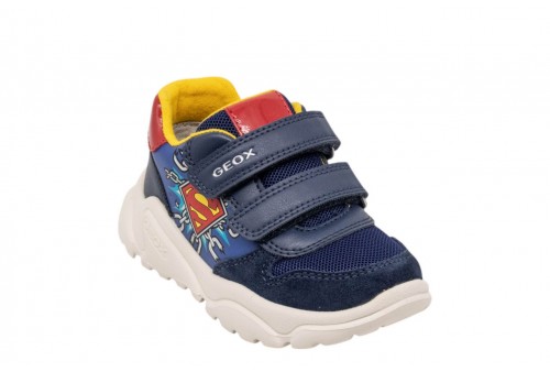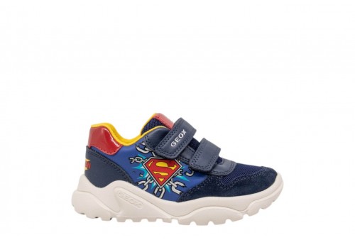 GEOX B BIMBO CIUFCIUF B655RB0BC22C4245 LT NAVY/RED. Sneaker baby dal design contemporaneo d'ispirazione running, nata dalla collaborazione tra Geox e Warner Bros. In questa variante blu navy chiaro con dettagli rossi in materiale effetto pelle e scamosciato, presenta grafiche sulla tomaia dedicate al supereroe Superman. Dotata di suola super leggera e ammortizzata, Ciufciuf è l'ideale per completare i mini look più sportivi, unendo comfort e divertimento.