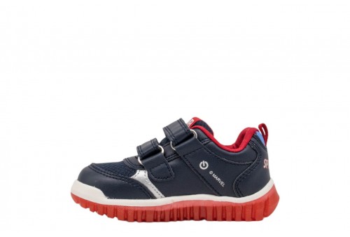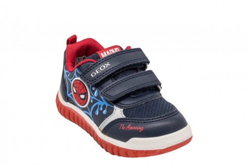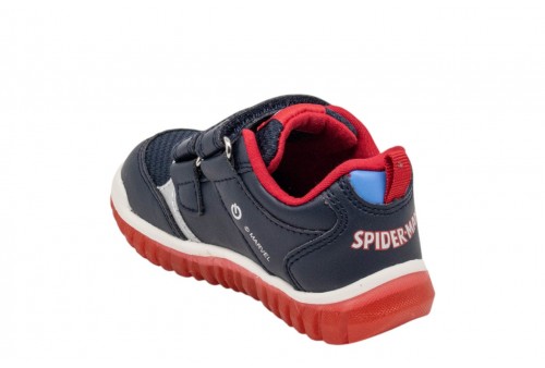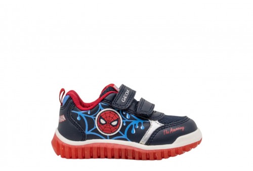 GEOX B BIMBO LIGHTYLOO B655ZC0BC14CF44D NAVY/AZURE. Sneaker baby trendy e sportiva, nata dalla collaborazione tra Geox e Marvel. In questa variante che mixa blu navy e azzurro, Lightyloo presenta grafiche e patch dedicate al supereroe Spider-Man. Realizzata in materiale effetto pelle e mesh, è dotata di luci integrate nella suola per aumentare il divertimento ad ogni passo.