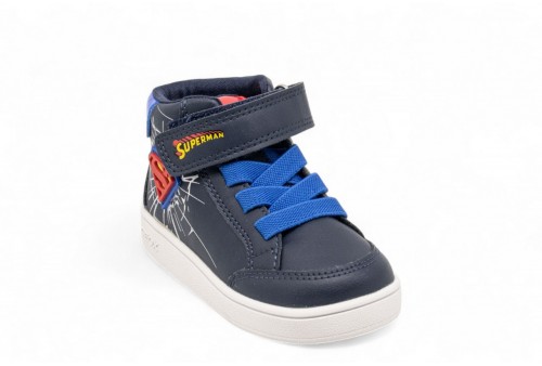 GEOX DC COMICS eclyper baby. Sneaker neonato frutto della collaborazione tra Geox e Warner Bros, che cattura l'energia del supereroe più amato attraverso un design sportivo e giocoso. In questa variante che mixa blu navy e royal blu, presenta una tomaia in materiale effetto pelle che garantisce una calzata pratica e confortevole durante le attività quotidiane. Eclyper completa con personalità i suoi outfit casual, accompagnando i primi passi con stile e libertà di movimento.