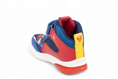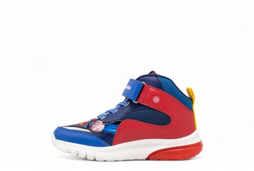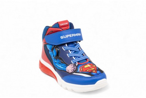 GEOX SNEAKER CIBERDRON. Sneaker bambino dal design sportivo e dinamico, frutto della collaborazione tra Geox e Warner Bros ispirata a Superman. In questa versione che mixa blu e rosso, è realizzata in materiale effetto pelle e mesh per garantire comfort durante il gioco. Ciberdron è pensata per accompagnare le avventure quotidiane con stile, grazie anche alle divertenti luci integrate nella suola che accendono ogni passo.Calzata facile e veloce.Calzatura con luci con pulsante On/Off.Rinforzo sulla punta. Sottopiede estraibile.