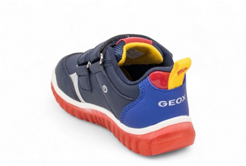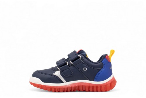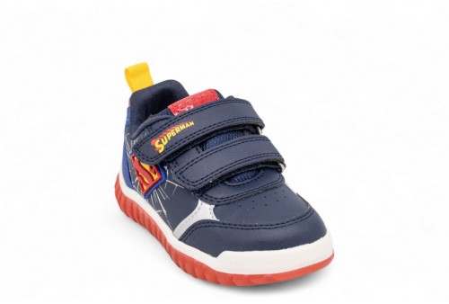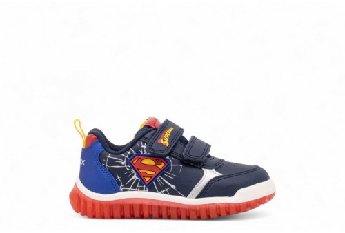 GEOX SNEAKER LIGHTYLOO. Sneaker neonato dall'anima sportiva, nata dalla collaborazione tra Geox e Warner Bros, che illumina ogni momento di gioco con le sue luci integrate nella suola. In questa versione che mixa blu navy e royal blu, è realizzata in materiale effetto pelle con applicazioni dedicate all'iconico Superman. Lightyloo è perfetta per rendere ancora più divertenti e dinamiche le attività quotidiane del piccolo supereroe.