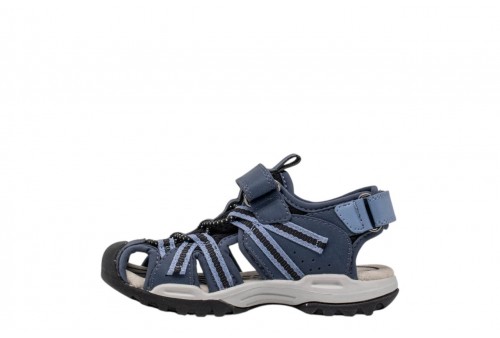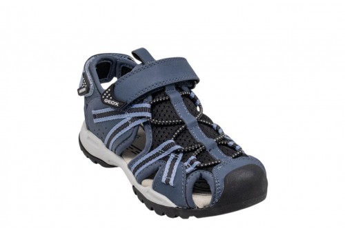 GEOX J BOREALIS B. J450RB014MEC4J9B DENIM/BLACK. Sandalo chiuso bambino traspirante e protettivo, dal design outdoor, ideale per le avventure estive. Leggero e totalmente regolabile, Borealis presenta una tomaia color denim con dettagli neri. Realizzato in mesh ed ecopelle bottalata, è dotato di punta rinforzata che protegge da urti e impatti, abbinata ad una suola dal grip efficace.