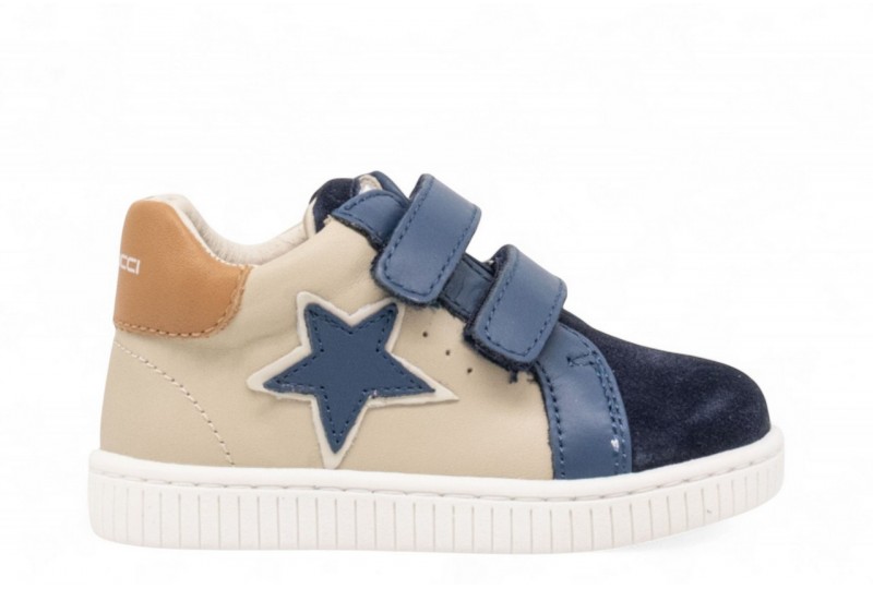 BALDUCCI SNEAKERS IN PELLE. Scarpa primi passi bambino realizzata in pelle beige con punta scamosciata a contrasto. Inserti in pelle blu. Talloncino in pelle cuoio. Linguetta con logo. Chiusura con doppio strappo. Logo al tallone. COLORE: blu