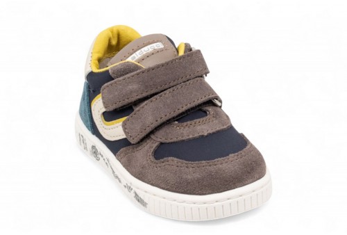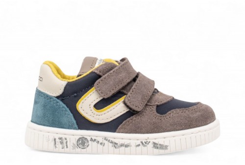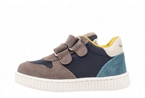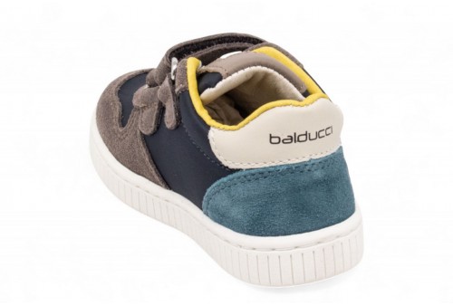 BALDUCCI SNEAKERS IN SUEDE. Scarpa primi passi bambino realizzata in pelle scamosciata grigia e blu con inserti in pelle bianca. Linguetta con logo. Chiusura con doppio strappo. Logo al tallone. COLORE: caribou