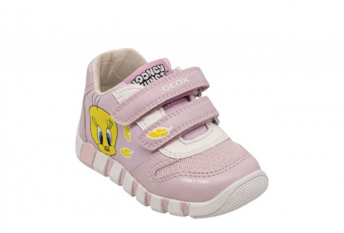 GEOX B BIMBA IUPIDOO B6558011BCC8004 PINK. Sneaker primi passi baby flessibile e ammortizzata, nata dalla collaborazione tra Geox e Warner Bros. In questa versione rosa, presenta grafiche dedicate al personaggio dei Looney Tunes Titti. Realizzata in tessuto e materiale effetto pelle, Iupidoo è leggera e traspirante, la compagna ideale per le sue prime avventure.
