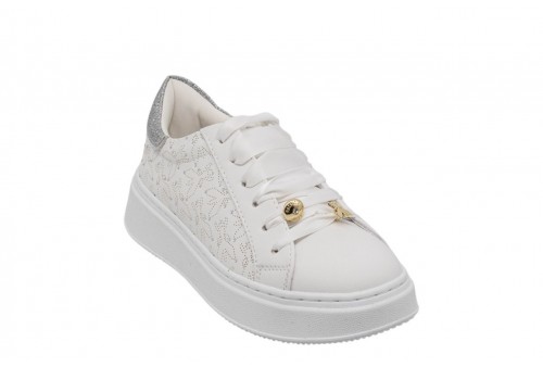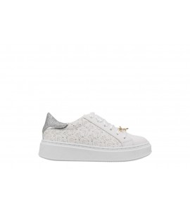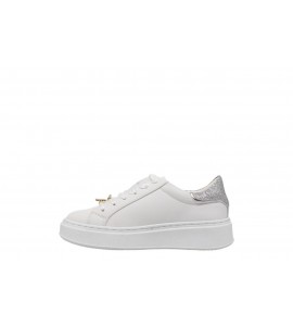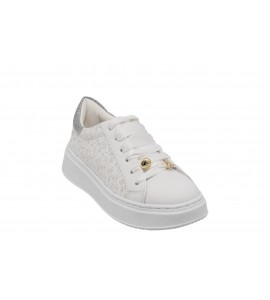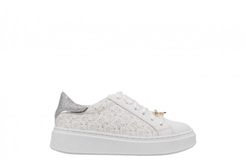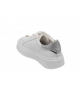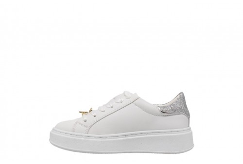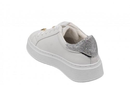 PATRIZIA PEPE bambina sneaker PPK327.06 BIANCO ECOV. Sneaker bambina in ecopelle con logo. Passalacci gioiello in metallo platino. Spoiler effetto glitter. Chiusura con lacci.