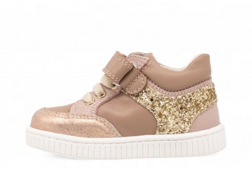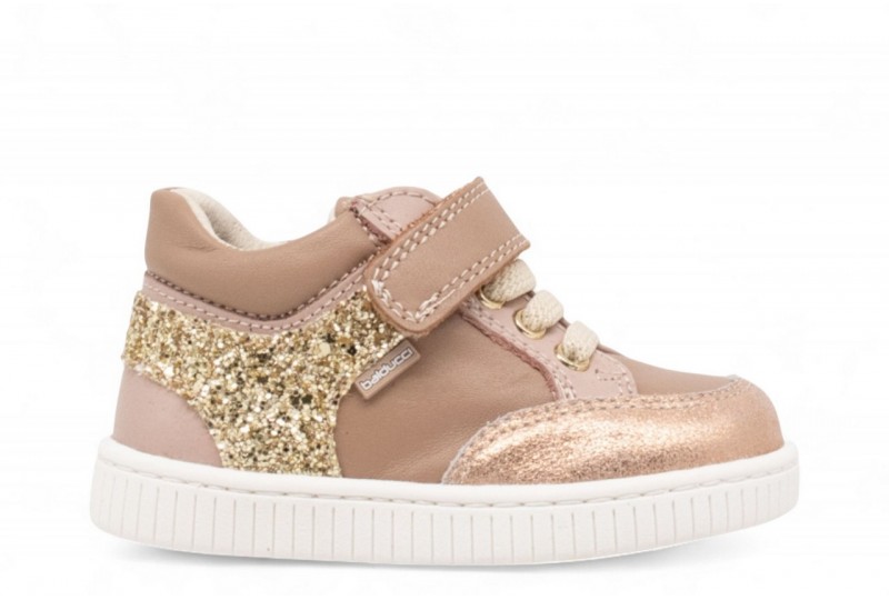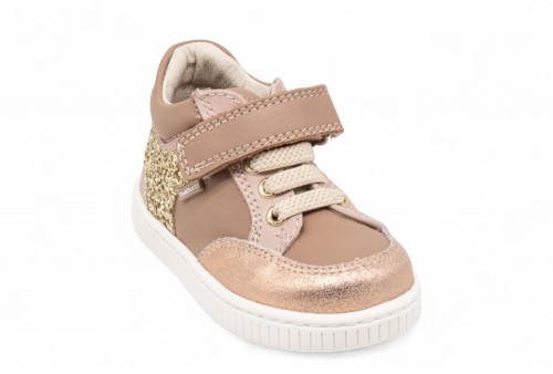 BALDUCCI SNEAKERS IN PELLE. Scarpa primi passi bambina realizzata in pelle con inserti laminati.Dettaglio glitterato. Linguetta con logo. Chiusura con strappo e lacci. COLORE: rosa