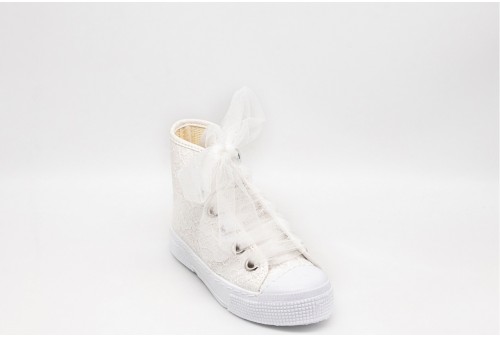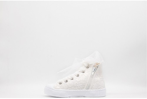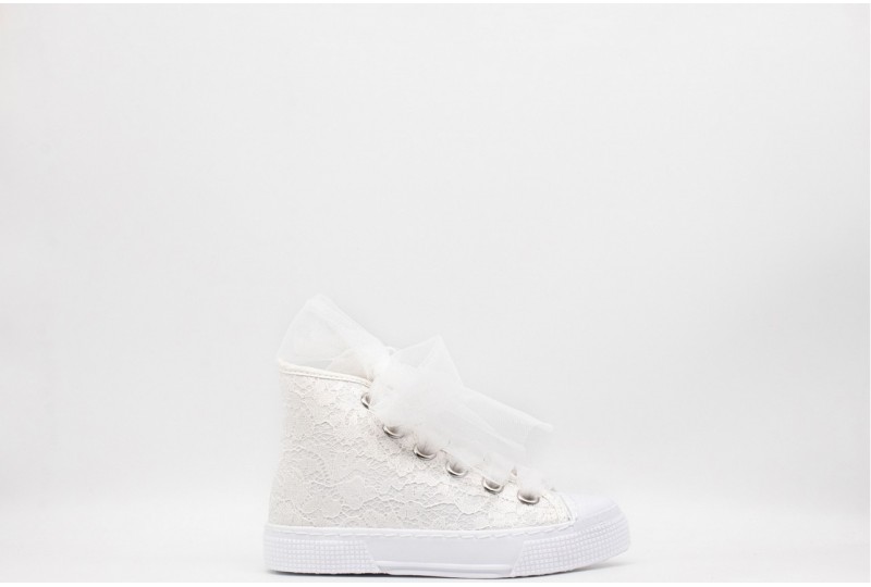 DEXCO SNEAKER IN PIZZO BAMBINA. Sneakers alta da bambina in pizzo realizzata in tessuto, alla moda e ideale per il tempo libero e per le cerimonie. Lacci in tulle tono su tono. COLORE: BIANCO