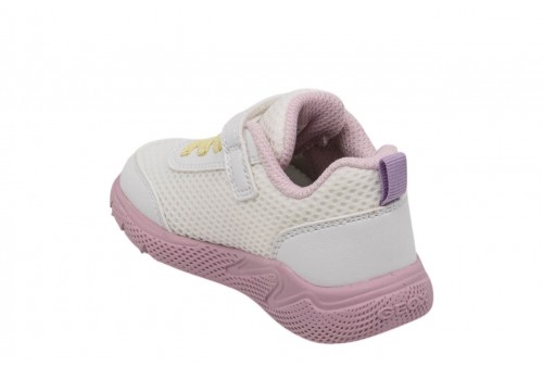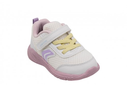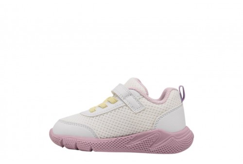 GEOX B SPRINTYE G. B454TD01454C0406 WHITE/PINK. Sneaker baby leggera e traspirante, dal design moderno d'ispirazione running. Qui proposta in bianco e rosa, si fa notare per il suo appeal sportivo e dinamico, abbinato a una suola ammortizzata garanzia di massimo comfort. Dotata di strap e comodi lacci elastici, Sprintye è realizzata in mesh e materiale effetto pelle e completa al meglio qualsiasi outfit casual.