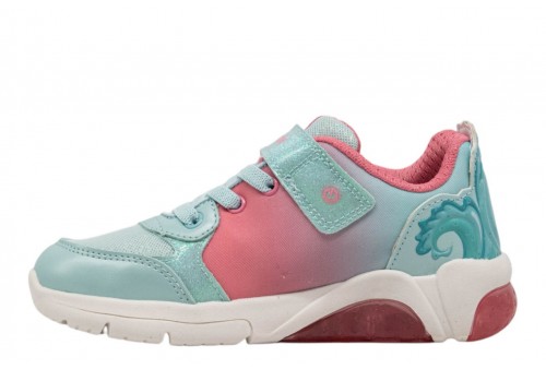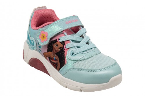 GEOX J bambina FADINILIGHT J65M4D0ANKCC3B7G WATER/COR . Sneaker bambina dal look active e femminile, nata dalla collaborazione tra Geox e Disney. In questa versione che mixa azzurro acqua e corallo, presenta grafiche con Vaiana di Oceania sulla tomaia e luci integrate nella suola. Dedicata alle piccole fan delle Disney Princess, è realizzata in tessuto stampato e vernice glitterata.