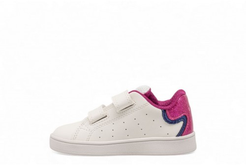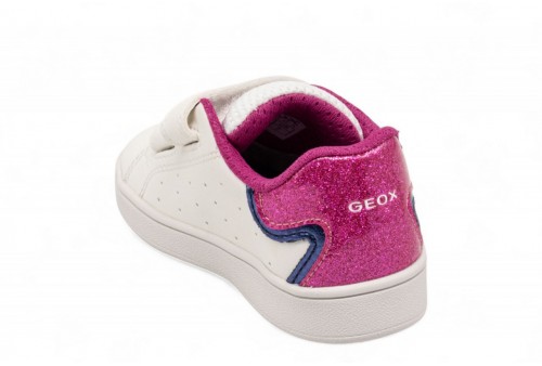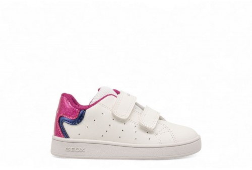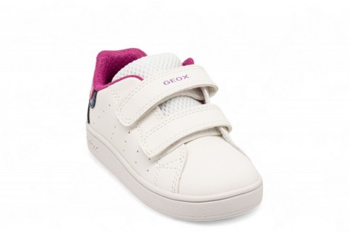 GEOX SNEAKER ECLYPER. Sneaker neonata d'ispirazione basket dal design sportivo contemporaneo e linee low-cut che donano libertà di movimento. In questa variante che mixa bianco e fucsia, è realizzata in materiale effetto pelle e impreziosita da dettagli in vernice glitterata che catturano la luce. Eclyper Baby completa con un tocco brillante gli outfit quotidiani, perfetta per aggiungere un accento sportivo ai primi passi.Calzata facile e veloce. Sottopiede estraibile.