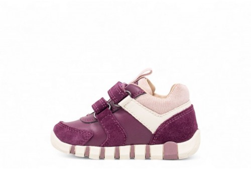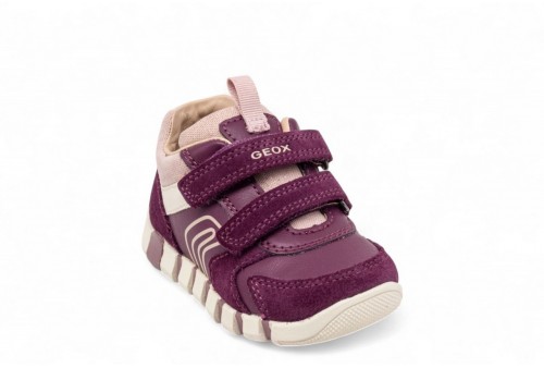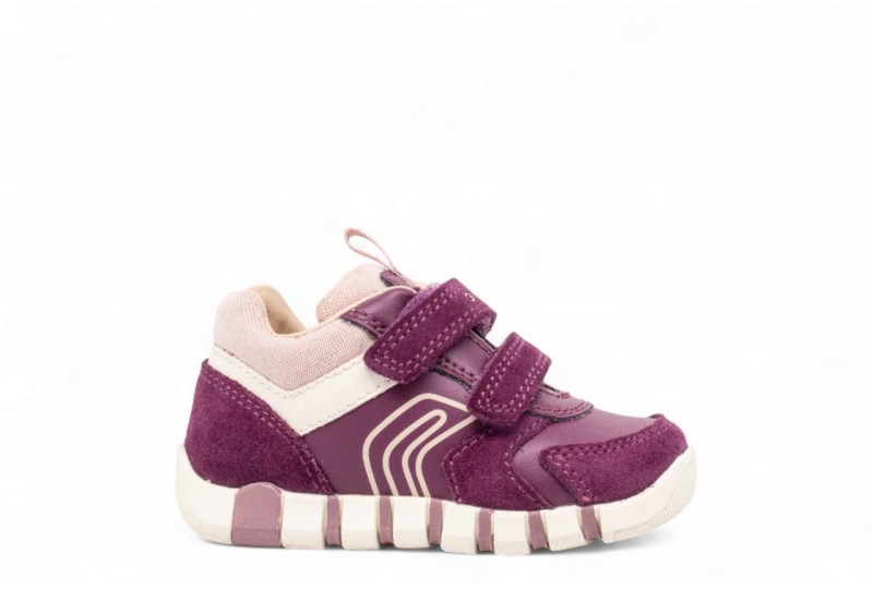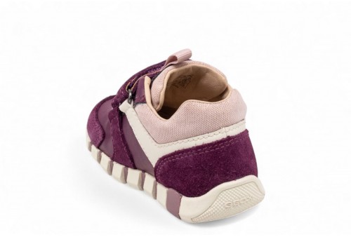 GEOX SNEAKER IUPIDOO.Sneaker imbottita e flessibile per i primi passi per neonate progettata per offrire alle più piccole il massimo comfort e la massima sicurezza quando iniziano a scoprire ciò che li circonda. Questa versione è stata realizzata in pelle scamosciata e un materiale effetto pelle in una colorazione viola scuro e rosa e offre morbidezza e durata. Con un tocco sportivo e un'atmosfera retrò, Iupidoo sarà il modo ideale per elevare le attività di routine dei piccoli avventurieri con un tocco di stile mentre iniziano a esplorare il mondo.