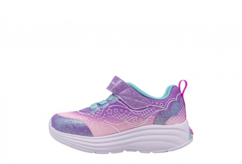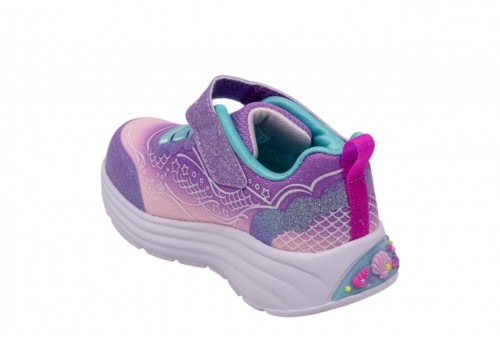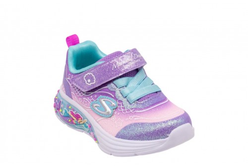 SKECHERS BIMBA My Dreamers - Lil Mermaid. Skechers My Dreamers - Lil Mermaid è un tripudio di luci allegre e colorate. Questo modello a tema cielo con luci presenta una tomaia in materiale tecnico e mesh glitterato sfumato con lacci elasticizzati, cinturino regolabile sul collo del piede e un’intersuola luminosa ben ammortizzata.