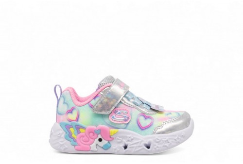 SKECHERS Unicorn Charmer - Lil Heart Sparkles. Illumina i suoi passi con il tocco magico dell’unicorno di Skechers Unicorn Charmer - Lil Heart Sparkles. Questo modello luminoso presenta una tomaia in mesh luccicante con una stampa a cuori arcobaleno, un’intersuola luminosa con un unicorno scolpito e una comoda soletta ammortizzata.