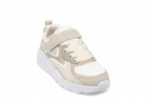 Skechers Uno Gen1. Sneakers in similpelle natural con dettagli bianchi, suola ad aria in corrispondenza del tallone, sottopiede memory foam, dettagli traforati, lacci bicolore, tirante sul retro e logo sul lato e sulla linguetta.