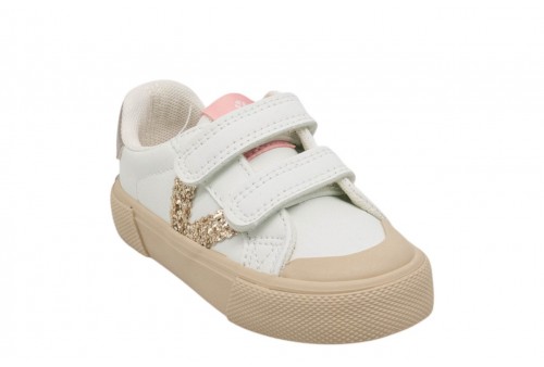 VICTORIA bimba sneaker 1065190. Sneaker sportive per bambina con logo in glitter, realizzate in effetto pelle. V laterale di victoria in glitter con texture, dettaglio posteriore metallizzato e tocco di colore sull'etichetta della linguetta. Chiusura con due strappi che garantiscono maggiore sostegno e facilitano la calzata, favorendo la loro autonomia. Suola in gomma leggermente ambrata con rinforzo sulla punta per maggiore resistenza e durata.