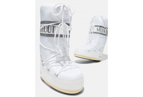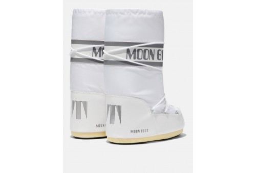 MOON BOOT STIVALE ICON BIANCO IN NYLON. Ispirato all'atterraggio lunare del 1969, l'inimitabile Moon Boot Icon è realizzato con una tecnologia che non ha nulla da invidiare a quella degli stivali spaziali. È dotato di una suola antiscivolo che garantisce la massima presa e di un’imbottitura isolante che tiene il piede caldo e asciutto in ogni condizione climatica.