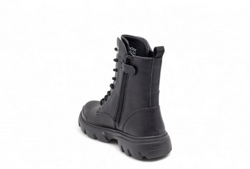 GEOX ANFIBIO JUNETTE Bambina. Stivaletto bambina dal design contemporaneo e femminile, dotato di un pratica zip laterale che garantisce una calzata perfetta. Proposto in total black, presenta una tomaia in materiale effetto pelle che conferisce un carattere urbano e ricercato. Junette aggiunge un tocco glamour ai look cittadini e scolastici, interpretando lo stile delle più grandi con personalità. COLORE: NERO