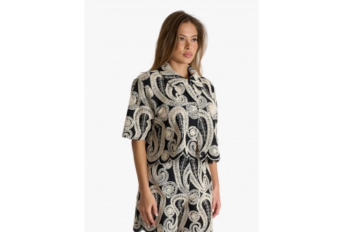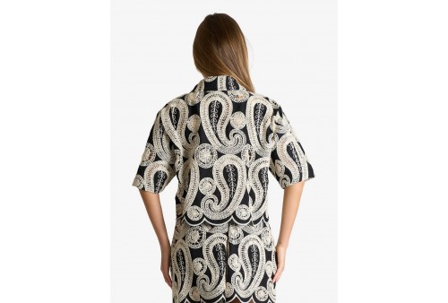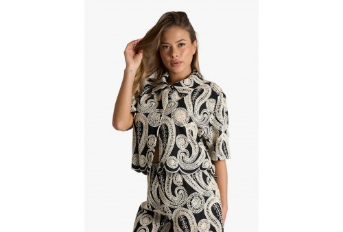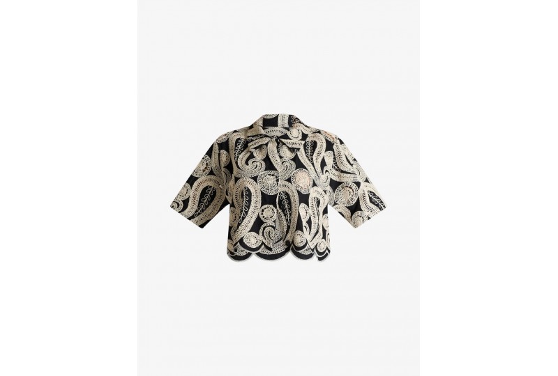 JIJIL JPE26CA148.0PZ0023/0266 CAMICIA NERO/AVO. Questa camicia Jijil a maniche corte è un capo dal design ricercato, caratterizzato da un'elegante ricamo paisley all-over in contrasto crema su fondo nero. Il taglio boxy e l'originale orlo smerlato (scalloped) conferiscono un tocco contemporaneo e femminile. Realizzata in fresco lino, è ideale per outfit estivi chic e distintivi.