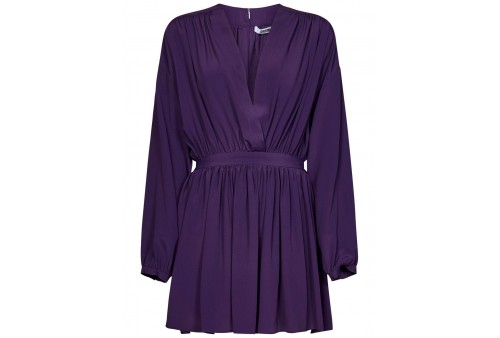 GRIFONI Miniabito color uva a maniche lunghe in misto seta con profondo scollo a V. Chiusura posteriore con zip a scomparsa sulla gonna; bottoni rivestiti in tessuto dietro al collo. Profondo scollo a V incrociato; Maniche lunghe a kimono, arricciature sulle spalle, polsini con bottone rivestito in tessuto. Profondo cut-out sulla schiena; Carré posteriore dritto con arricciature.