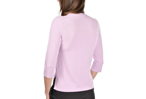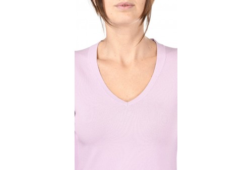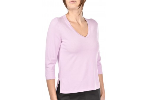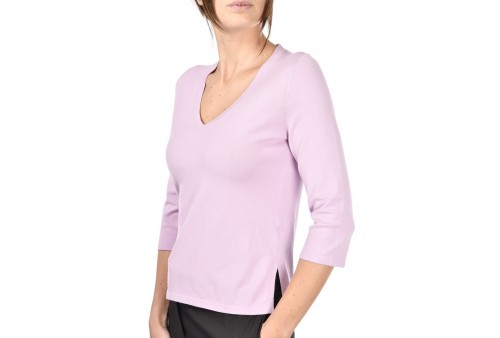 GRAN SASSO MAGLIA SCOLLO A V. Maglia in viscosa con ampio scollo a V. Le maniche a 3/4 e gli spacchetti laterali rendono il capo fresco e confortevole. Un modello versatile, adatto a diversi abbinamenti sia con pantalone che gonna. Prodotto in Italia.