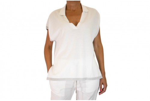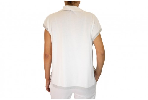 GRAN SASSO POLO DONNA. Polo maniche corte con scollo a V e colletto. Profili a contrasto in fibra metallica. COLORE: BIANCO