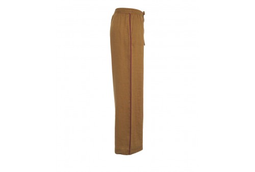 OTTOD'AME DP0032 PANTALONE RHUM. Pantaloni in lino si distinguono per la loro texture traspirante e il sofisticato taglio a gamba larga. L'elastico in vita con coulisse integrata garantisce il massimo comfort e una vestibilità personalizzata. Le bande laterali a contrasto aggiungono un tocco sportivo di lusso, rendendoli un capo essenziale per i look estivi più raffinati.