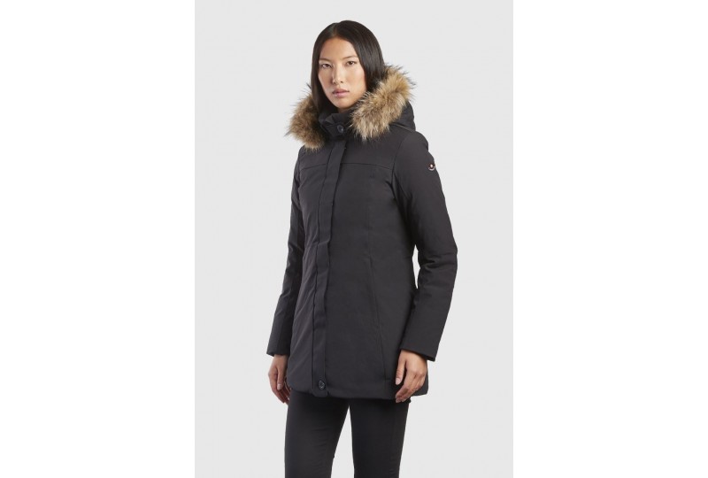 CANADIENS GLORY TECK. Giacca tecnica della linea Zeropuntotech® progettata con tessuto Hidra-Nek® Two Way Stretch, top di gamma dei multilayer. Internamente é presente un'imbottitura in piuma che assicura comfort, calore e protezione. Il capo é composto da un'apertura centrale con zip doppio cursore protetta da pattina con snaps metallici, ampie tasche laterali con zip protette da filetti, cappuccio staccabile, imbottito e rifinito con un soffice bordo in pelliccia di raccoon rimovibile.