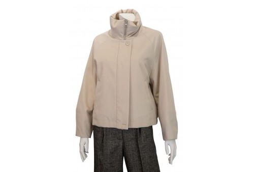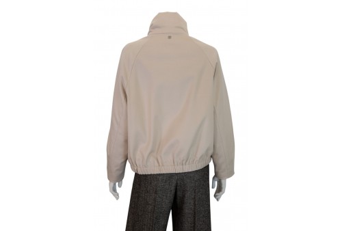 DUNO giacca oversize in lana tecnica. Bomber "LUSIA PRATO" con collo in piedi in lana tecnica con imbottitura in piuma, caratterizzato da chiusura frontale con zip doppio cursore a tutta altezza, nascosta da ampia patta con bottoni. Elastico nascosto al fondo dietro, tasche laterali a filetto e maniche ampie con taglio raglan con effetto bombato, restituito dalle cuciture presenti sul fondo manica.Lana tecnica leggera in struttura diagonale appena percettibile caratterizzata da morbidezza, aspetto pulito in superficie e resistenza al pilling. L’imbottitura in piuma permette la termoregolazione del corpo, preservando il microclima interno al capo.COLORE: BIANCO/AVORIO