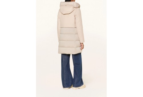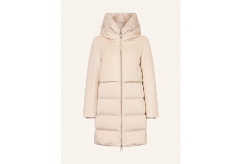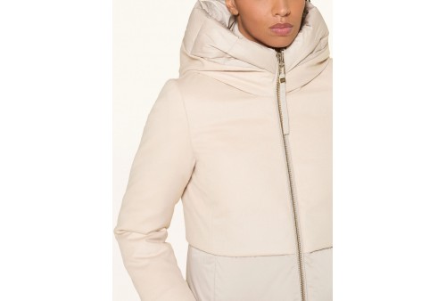 DUNO piumino BALLON X. Piumino bi-materiale con cappuccio realizzato con la combinazione di lana e raso tecnico. Chiusura frontale con zip doppio cursore, tasche laterali con zip invisibile nascosta nel fianco, dettaglio al bordo cappuccio in tessuto tecnico e polsino interno in maglia tecnica.