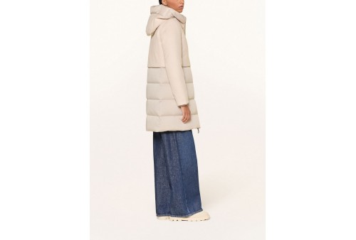 La lana tecnica con disegno diagonale appena percettibile è accoppiata con una maglina tecnica che le conferisce resistenza all’acqua, corposità e consistenza, pur mantenendo lucentezza e una superficie morbida e pulita. Utilizzata in combinazione con tessuto tecnico dalla struttura a raso con effetto serico con proprietà water-resistant e comfort stretch. L’imbottitura in piuma garantisce un elevato comfort termico e protezione dagli agenti atmosferici.
