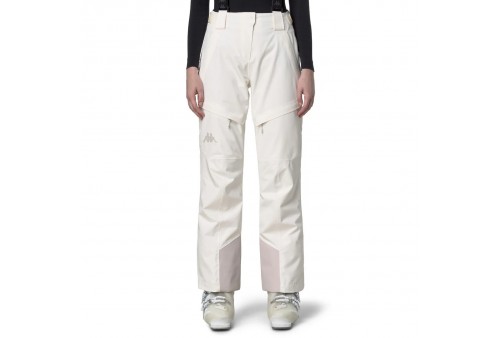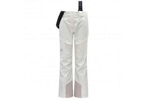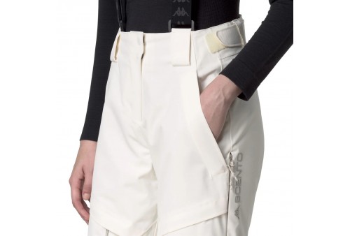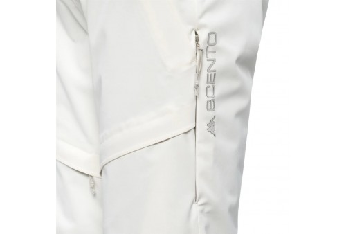 KAPPA 6CENTO Pantaloni 665C donna. Pantaloni sportivi bianchi da donna con imbottitura e protezione impermeabile. Pantaloni da donna imbottiti realizzati in tessuto 2 strati stretch meccanico con WATERPROOF PROTECTION 20.000 mm H2O, BREATHABILITY 20.000 g/m²/24h e trattamento idrorepellente PFC-Free. L’imbottitura Fellex® 60 g offre calore leggero e comfort ottimale. Slim fit per una vestibilità aderente e funzionale. Dotati di bretelle staccabili personalizzate con Banda e ripetizione del logo Omini, regolazione in vita, tasche con chiusure zip impermeabili, rinforzi sul fondo gamba, getta per scarponi e cuciture termonastrate. Completano il design il logo 6CENTO applicato e il logo Omini applicato.