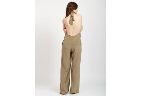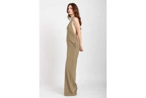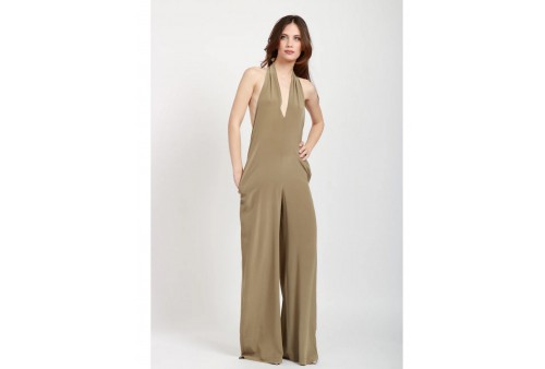 JUCCA TUTA IN SETA. Tuta Lunga in Seta Verde Militare, scollo a V, fasce da annodare al collo, tasche sui fianchi, sul retro scollo profondo, chiusura con zip, gamba a palazzo, vestibilità regolare.