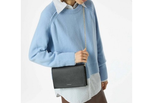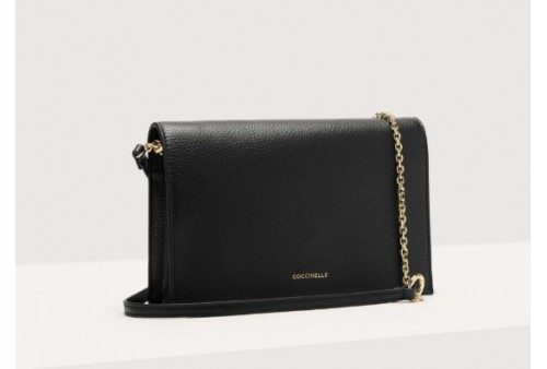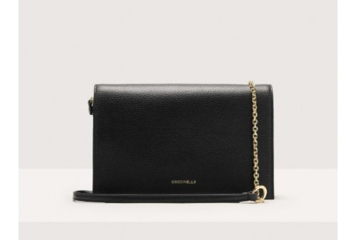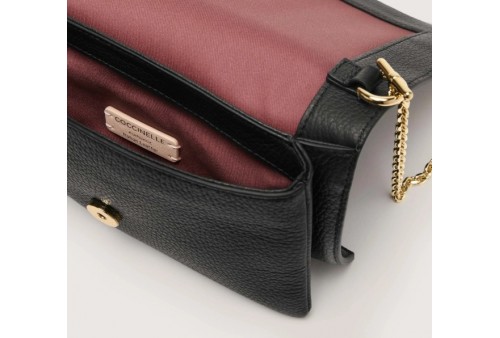 COCCINELLE BORSA DANDY. Borsa in pelle con grana .Chiusura con magnete .Tracolla removibile in pelle e catena per portabilità a spalla o a bandoliera. Due scomparti interni. Interno in tessuto. Galvanica oro chiaro. Logo timbro oro.