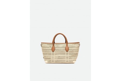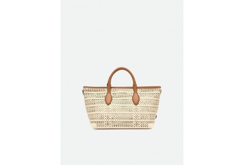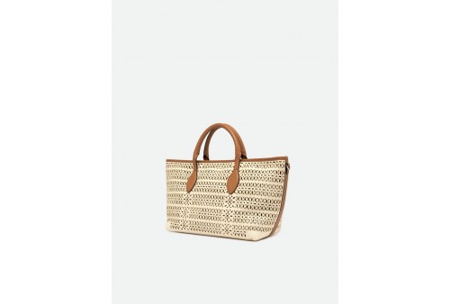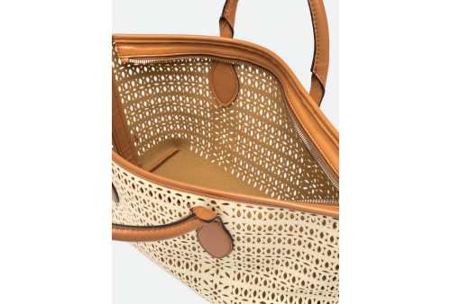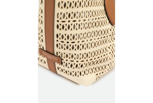 GIANNI CHIARINI BS 11506/COMM CNVLS PANNA-CORDA-CLAY. La borsa a mano Mashup di Gianni Chiarini Firenze è realizzata in canvas laserato, che dà vita a un sofisticato decoro traforato, rendendola unica e senza tempo. Dotata di due manici in pelle e chiusura con bottone magnetico, è ideale per completare un look casual quotidiano. Include una tracolla regolabile e removibile, per un’opzione crossbody pratica e versatile. Dimensioni: 30x22x14 cm.
