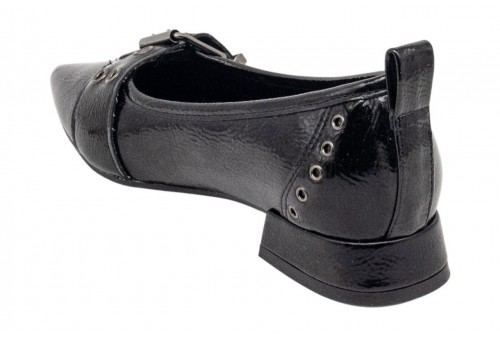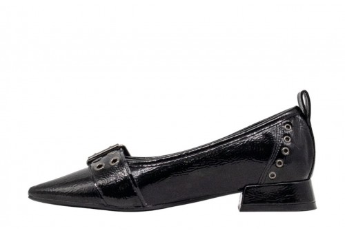 CARMELA BALLERINA A PUNTA. Fatto di vernice. Stile ballerina con chiusura a fibbia. Linguetta posteriore per accendere e togliere facilmente. Abbellimenti metallici ai lati. Soletta rimovibile. NERO