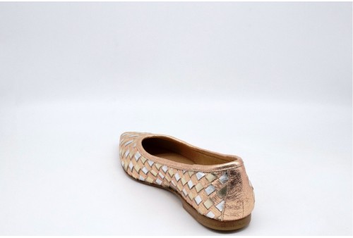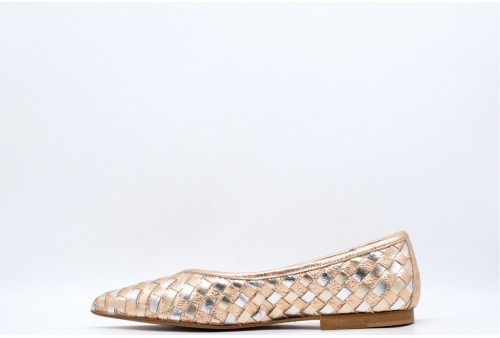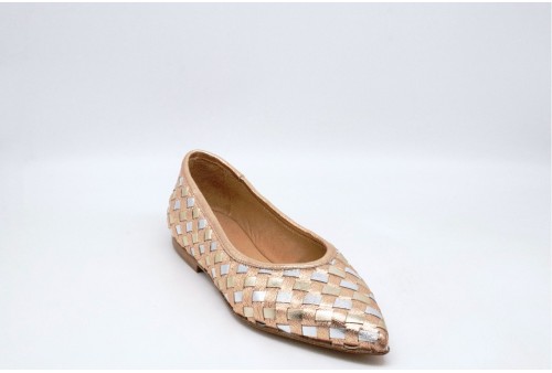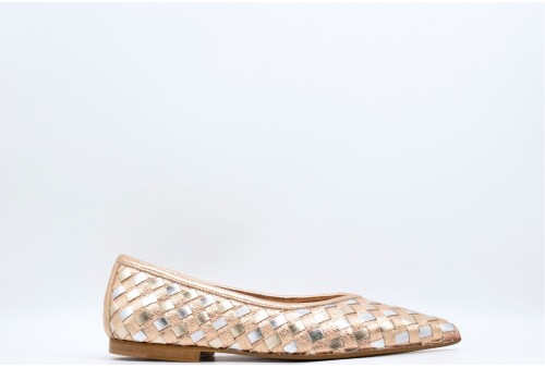 LAURA BELLARIVA BALLERINA INTRECCIATA. Ballerina a punta realizzata in pelle laminata bicolore con lavorazione intrecciata. COLORE: rame
