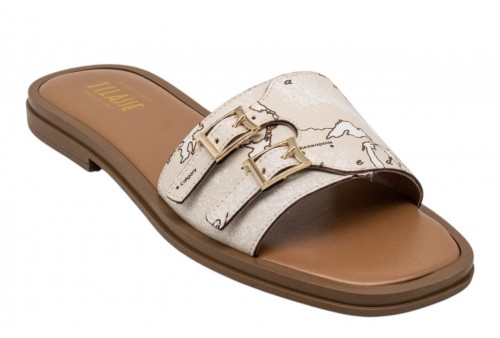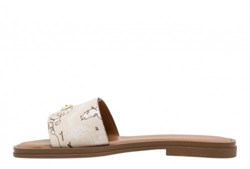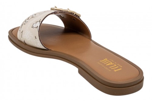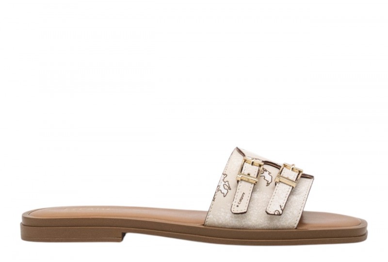 ALVIERO MARTINI CIABATTA FLAT 1372/9820/0900 WHITE. Ciabatta flat realizzata in PU. Fascia con stampa Geo caratterizzata da due fibbie dorate.