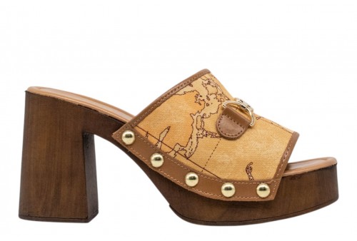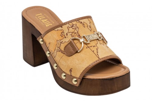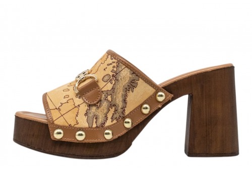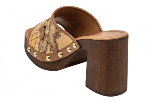 ALVIERO MARTINI sandalo scalzato 1394/431H/0010 NATURAL CO. La stampa Geo Classic viene esaltata dalla ricchezza dei dettagli di queste mules: la fascia in reps è arricchita da dettagli in pelle liscia e chiodi dorati, mentre il fondo in poliuretano effetto legno con tacco svasato e punta quadra aggiunge carattere e un effetto armonioso. Il morsetto oro chiaro con logo 1? Classe aggiunge il tocco finale, rendendo il modello un vero must-have di stagione.