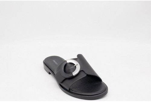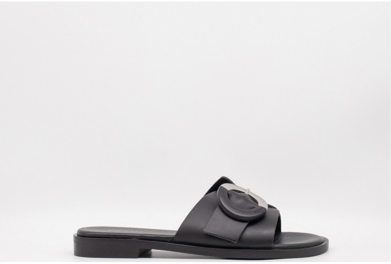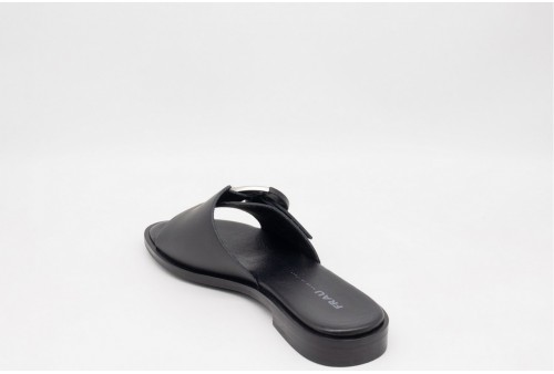 FRAU CIABATTINA IN PELLE. Sandalo in pelle con una fascia lasrga con fibbia tonda decorativa.Tomaia in pelle a taglio vivo . Accoppiatura in microfibra. Morbidissimo sottopiede foderato pelle. Suola TPU con guardolo in cuoio rigenerato. COLORE: nero