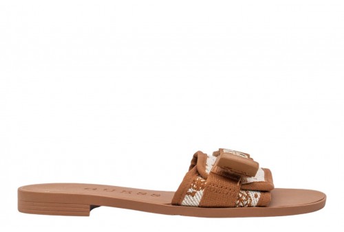 GUESS CIABATTINA EYZE FLJEL5FAB03 COGNAC. Ciabattina donna realizzata in pu con mono fascia con strappo . Logo lettering sul davanti in metallo dorato. Fascia regolabile.