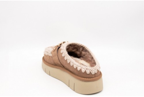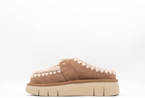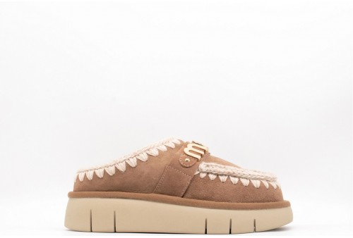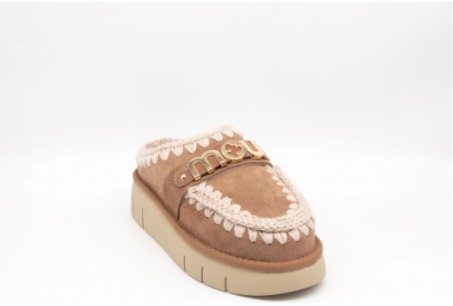 MOU Bounce clog metal logo. Il bounce clog con logo metallizzato è sapientemente realizzato a mano in vera pelle di montone double face e dettagli all'uncinetto, distintivi di mou. Il plantare imbottito in pelle e la suola leggera in EVA & gomma rendono questo modello incredibilmente comodo da indossare.