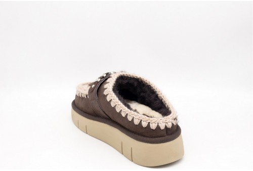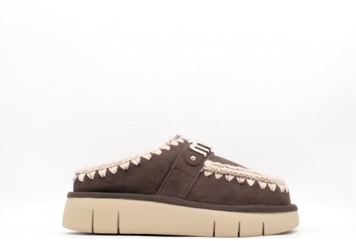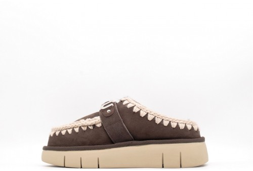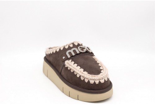 MOU Bounce clog metal logo. Il bounce clog con logo metallizzato è sapientemente realizzato a mano in vera pelle di montone double face e dettagli all'uncinetto, distintivi di mou. Il plantare imbottito in pelle e la suola leggera in EVA & gomma rendono questo modello incredibilmente comodo da indossare.