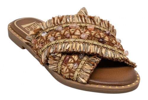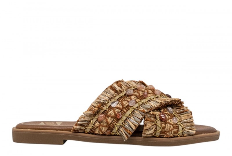 O-JOO ciabattina flat OL61510A MILEY CROSS natural. Ciabattina flat con fasce incrociate impreziosite da appplicazioni gioiello e frange in corda.
