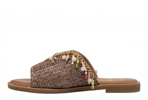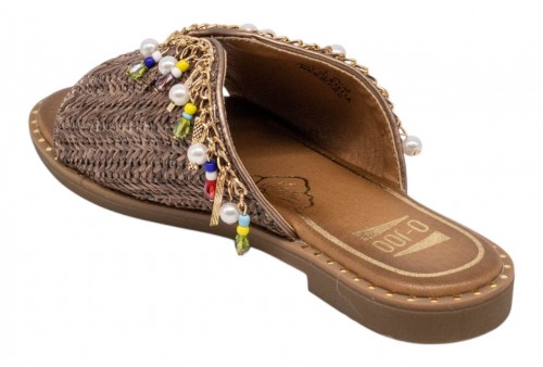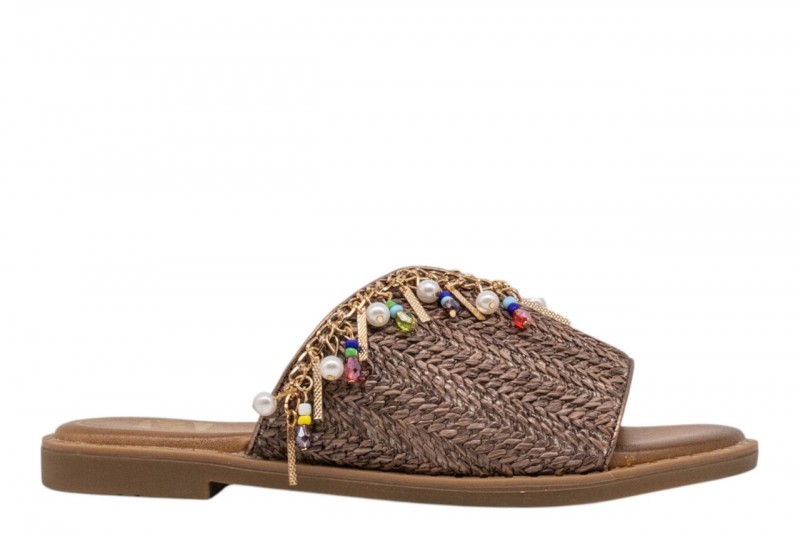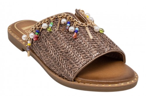O-JOO ciabattina flat OL61511A MILEY CARRIBEAN brown. Ciabattina flat con maxi fascia in tessuto intrecciato impreziosita da appplicazioni gioiello.