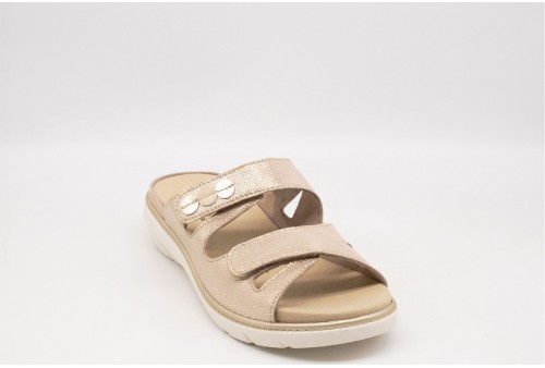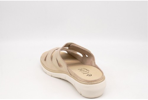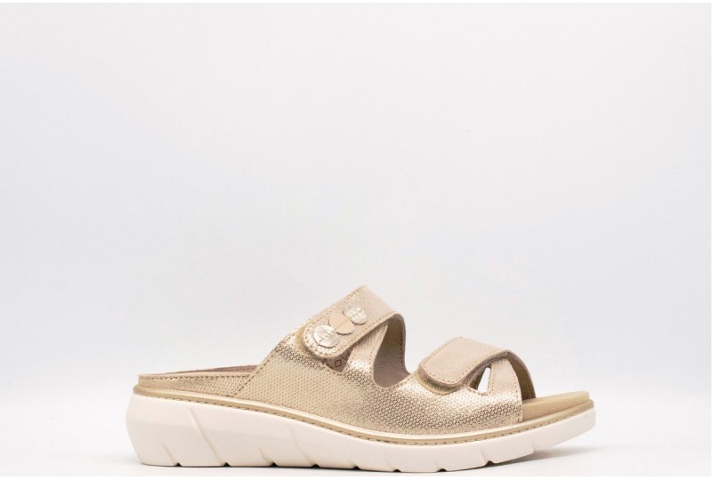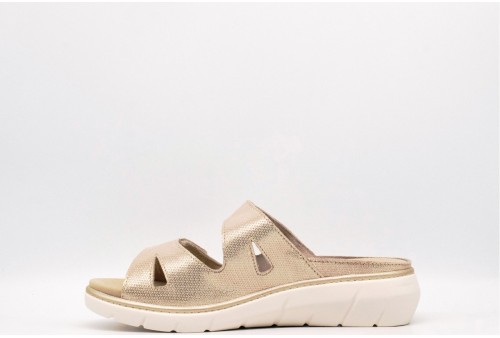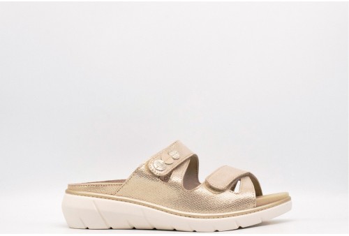 TOMASI ELITE CIABATTA GLORENZA. Ciabatta con zeppa realizzata in morbida pelle laminata con strappo. Dettaglio inserti traforati. Plantare estraibile. COLORE: oro