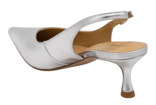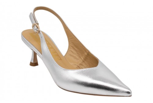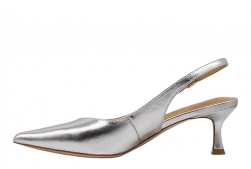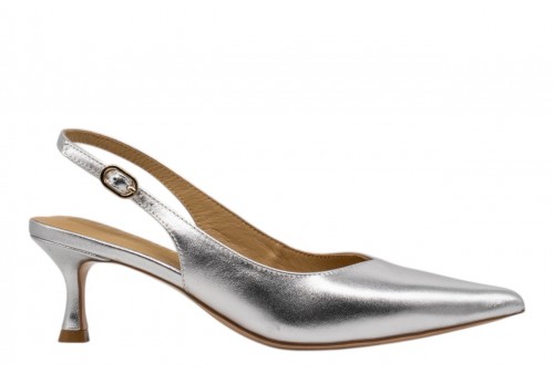 CHICONIC slingback 226.01.26VT.SLV VITELLO SILVER. Slingback a punta realizzata in pelle effetto laminato argento. Chiusura con cinturino regolabile con fibbia alla caviglia. Tacco 6cm.