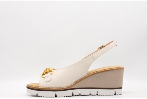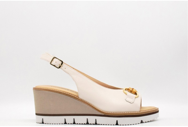 DONNA SOFT SANDALO CON ZEPPA. Sandalo spuntato realizzato in pelle. Accessorio decorativo frontale. Comoda zeppa. Chiusura con cinturino con fibbia alla caviglia. COLORE: avorio