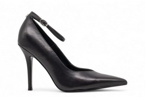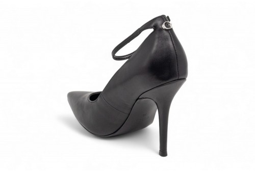 GUESS DECOLLETE NAPRIL IN PELLE. Decollete in vera pelle.Modello a punta.Altezza tacco 10,1 cm.Chiusura con cinturino alla caviglia.Dettaglio scritta logo sul retro. Sottopiede in pelle. Fodera interna in poliuretano. Suola in gomma. COLORE: NERO