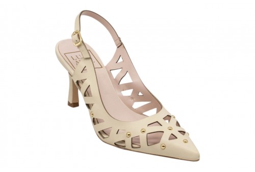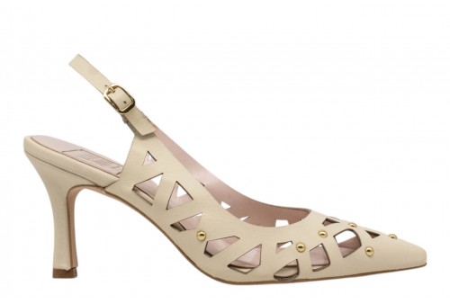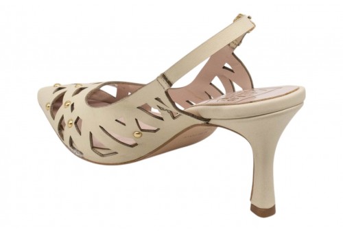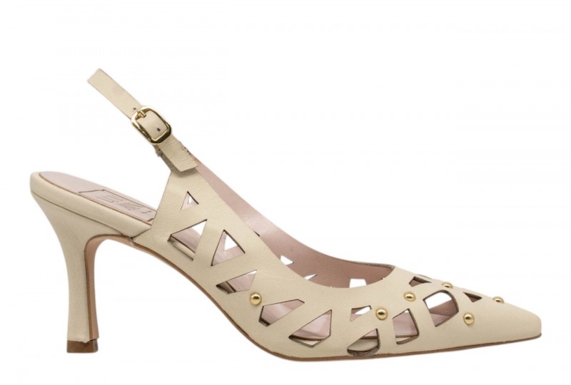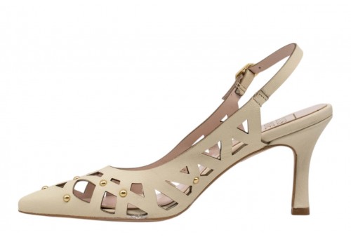 LUISANNE DECOLLETE 328/05 NAPPA PANNA. Decollete a punta realizzato in pelle traforata con dettaglio borchiette in metallo dorato. Chiusura con cinturino con fibbia regolabile alla caviglia.